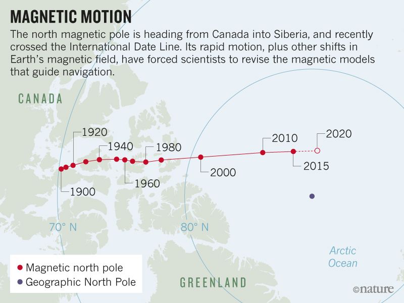 Движение магнитного полюса происходит от канадской Арктики к Сибири и Таймыру, преодолев линию перемены дат - условную границу на поверхности Земли, которая проходит от полюса до полюса, с разницей в местном времени в сутки. Как считают ученые, магнитный полюс должен достичь точки через 30-40 лет.