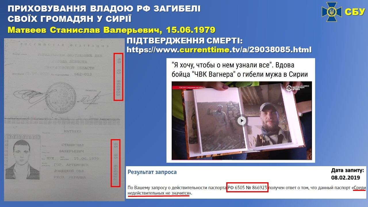 В СБУ добавили, что данные о смерти "вагнеровцев" подкреплены свидетельствами их родных об обстоятельствах смерти в Сирии, фотографиями свидетельств о смерти и мест захоронений наемников.
