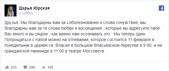 В церкви святого Власия в Большом Власьевском переулке в 08.00 по киевскому времени началось отпевание. А в 10.00 по Киеву в театре Моссовета начнется гражданская панихида.