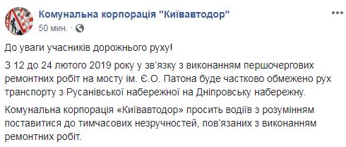 "С 12 по 24 февраля 2019 года в связи с выполнением первоочередных ремонтных работ на мосту Патона будет частично ограничено движение транспорта с Русановской набережной на Днепровскую набережную", - говорится в сообщении. Коммунальщики просят водителей с пониманием отнестись к временным неудобствам, связанным с выполнением ремонтных работ.