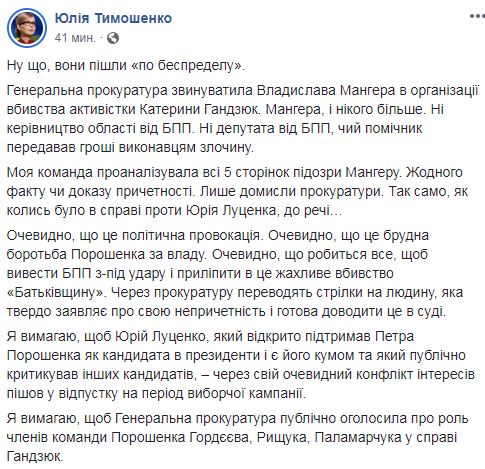 "Ну что, они пошли "по беспределу". Генеральная прокуратура обвинила Владислава Мангера в организации убийства активистки Екатерины Гандзюк. Мангера, и никого больше. Ни руководство области от БПП. Ни депутата от БПП, чей помощник передавал деньги исполнителям преступления", - отметила Тимошенко. По ее словам, в подозрении Мангеру нет ни единого факта или доказательства его причастности к преступлению, только домыслы прокуратуры.