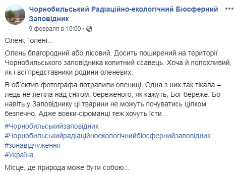"Олень благородный или лесной. Достаточно распространенное на территории Чернобыльского заповедника копытное млекопитающее. Хотя и пугливый, как и все представители семейства оленевых", - сказано в сообщении.