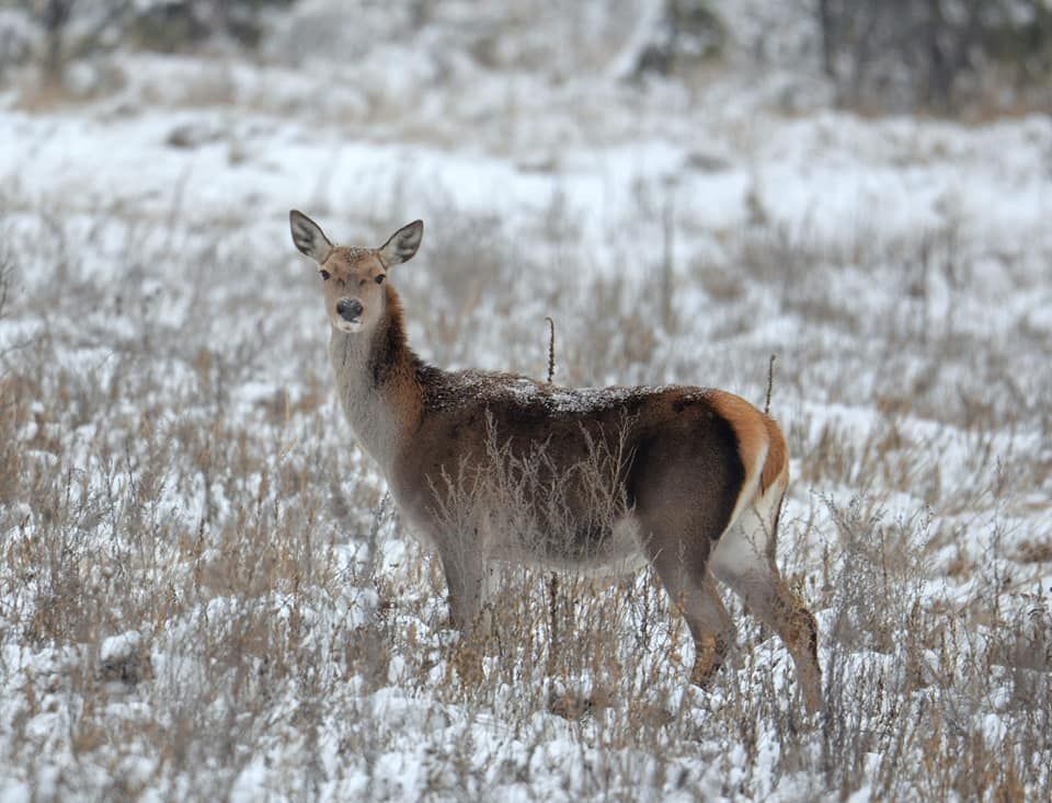 В заповеднике рассказывают, что в объектив фотографа попали оленицы. Одна из них стремительно убежала.