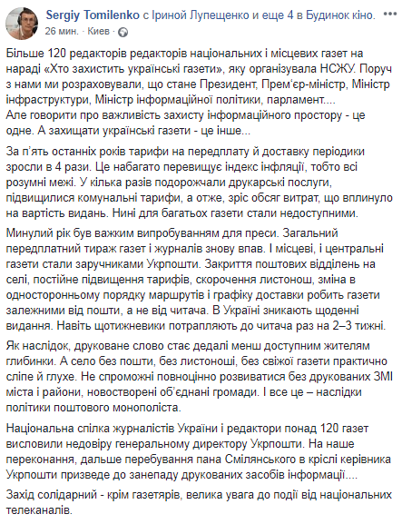 "Прошлый год был тяжелым испытанием для прессы. Общий подписной тираж газет и журналов снова упал. И местные, и центральные газеты стали заложниками Укрпочты. Закрытие почтовых отделений на селе, постоянное повышение тарифов, сокращение почтальонов, изменение в одностороннем порядке маршрутов и графика доставки делает газеты зависимыми от почты, а не от читателя. В Украине исчезают ежедневные издания. Даже еженедельники попадают к читателю раз в 2-3 недели", - пишет Томиленко.