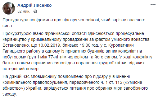 "Прокуратурой Ивано-Франковской области осуществляется процессуальное руководство в уголовном производстве по факту умышленного убийства. Установлено, что 10 февраля 2019 года, около 19:00, в селе Куропатники Галицкого района в одном из частных домов возник конфликт на бытовой почве между 77-летним мужчиной и его сыном. В ходе конфликта отец ножом нанес сыну два ранения грудной клетки, от которых потерпевший скончался", - сообщил Лысенко в Facebook.