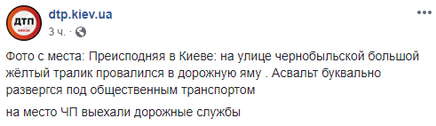 На место инцидента выехали дорожные службы. "Преисподняя в Киеве: на улице чернобыльской большой желтый тралик провалился в дорожную яму. Асфальт буквально разверзся под общественным транспортом", - сообщили в паблике.