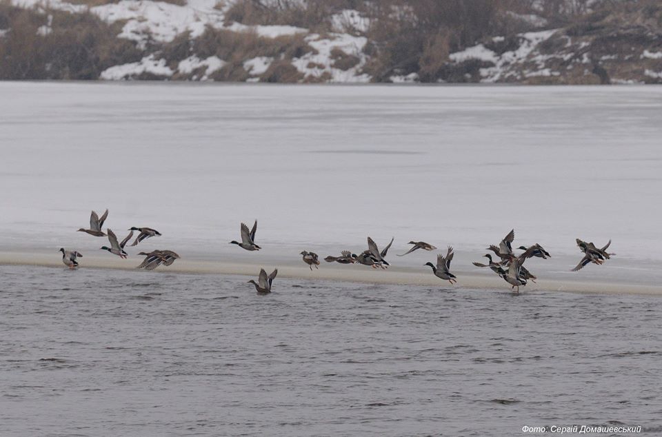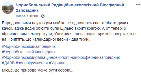 "В течение зимы ученым почти не удавалось наблюдать диких уток, ведь водные объекты были плотно покрыты льдом. А вот теперь, с повышением температуры, появились плеса воды - кряквы возвращаются на Припять. До календарной весны - две недели. Место, где природа может быть собой", - сказано в сообщении.