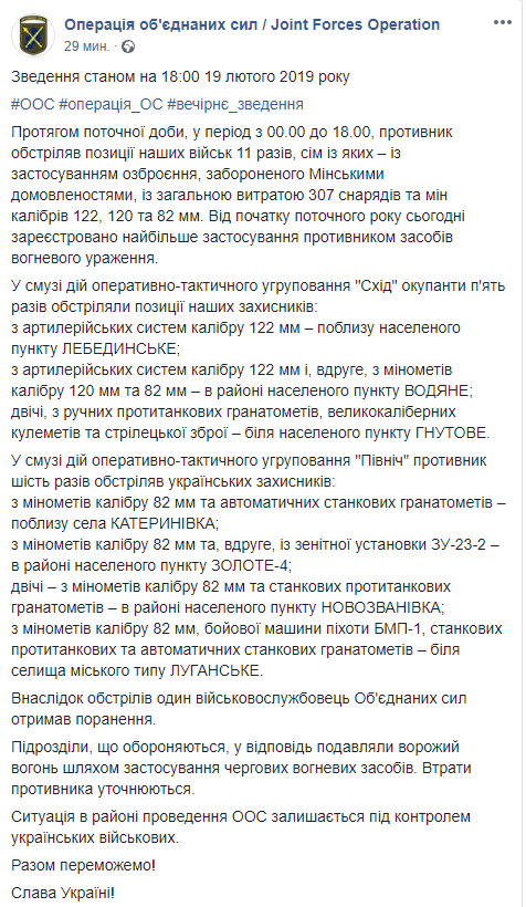 Во вторник, 19 февраля, с полуночи до 18.00 противник совершил 11 обстрелов позиций украинской армии на Донбассе, в результате чего один солдат был ранен. Об этом сообщается в сводке штаба Объединенных сил на странице пресс-центра ООС в социальной сети Facebook.