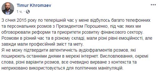 Глава Нацкомиссии по ценным бумагам Тимур Хромаев назвал политической манипуляцией обнародованный в сети журналистом Александром Дубинским аудио-файл, где голос, похожий на президента Петра Порошенко, спрашивает у голоса, похожего на Хромаева: "Где тебе, @лядь еще, Тимур, реформ не хватает?" Об этом он сообщил у себя на странице в Facebook.