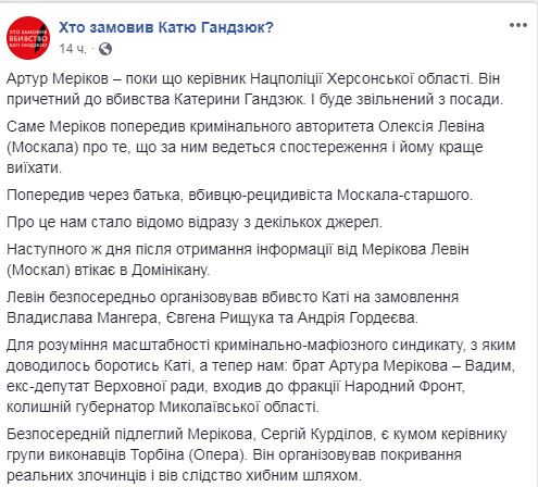 Активисты группы "Кто заказал Катю Гандзюк?" заявили, что к убийству советника мэра Херсона причастен действующий руководитель Нацполиции Херсонской области Артур Мериков. Об этом группа написала на своей странице в Facebook.