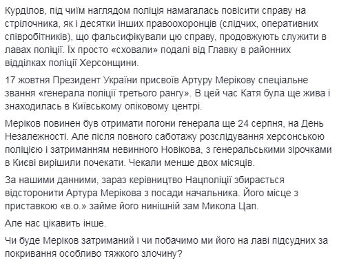 "Но после полного саботажа расследования херсонской полицией и задержанием невиновного Новикова, с генеральскими звездочками в Киеве решили подождать. Ждали менее двух месяцев", - отметили активисты. "Но нас интересует другое. Будет Мериков задержан и увидим ли мы его на скамье подсудимых за покрытие особо тяжкого преступления? ", - резюмируется в сообщении.