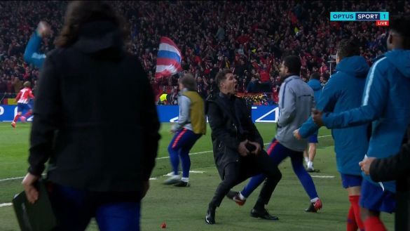 Cтадион взорвался, игроки бросились на трибуны, где болельщики едва не задушили их в объятиях. А главный тренер Атлетико Диего Симеоне показал всему миру, скажем так, очень мужской жест. Словами это сложно описать. Лучше просто посмотреть. Видео разместил в сети пользователь с ником CarefreeKizzy.