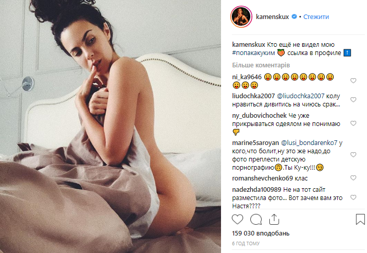 На сфото Настя запечатлена обнаженной, сидящей в постели, прикрываясь одеялом.  Вероятно, таким образом певица решила еще раз привлечь внимание к недавно вышедшему клипу на песню "Попа как у Ким". Ссылку на него звезда оставила в комментарии к снимку.