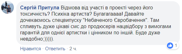 В комментарии к посту Ясинского ведущий Нацотбора Сергей Притула намекнул, что продюсеры Нацотбора получали предложения от артистов проекта, в которых некоторые требовали гарантий для исполнителя, другие же называли цену участия в конкурсе.