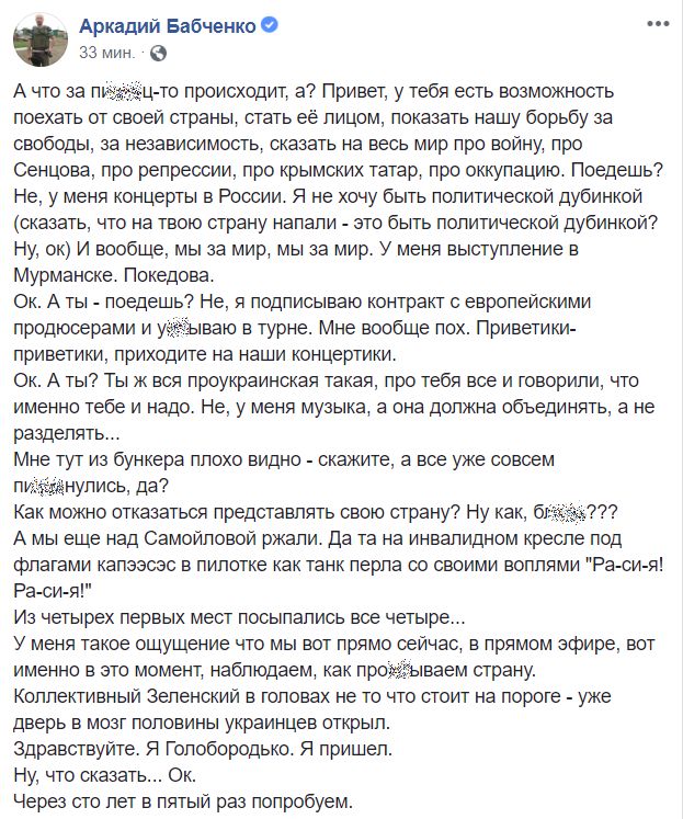 А вот журналист Аркадий Бабченко недоволен тем, что артисты отказываются ехать на конкурс: "А что за п***ц-то происходит, а? Привет, у тебя есть возможность поехать от своей страны, стать её лицом, показать нашу борьбу за свободы, за независимость, сказать на весь мир про войну, про Сенцова, про репрессии, про крымских татар, про оккупацию. Поедешь? Не, у меня концерты в России. Я не хочу быть политической дубинкой (сказать, что на твою страну напали - это быть политической дубинкой? Ну, ок) И вообще, мы за мир, мы за мир. У меня выступление в Мурманске. Покедова.
