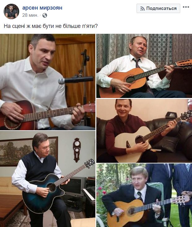 Музыкант Арсен Мирзоян также шутит над отбором на конкурс. Он написал: "На сцене же должно быть не больше пяти?" и приложил фотографии Януковича, Кличко, Кучмы, Ляшко и Ахметова с гитарами.
