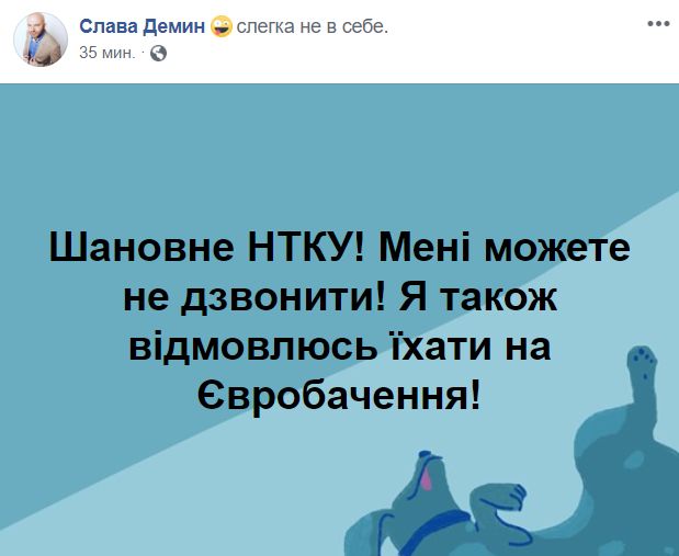 Радиоведущий Слава Демин шутит о том, что телечиновники уже обзванивают всех подряд, чтобы затащить их на песенный конкурс: "Уважаемые НТКУ! Мне можете не звонить! Я также откажусь ехать на Евровидение!"