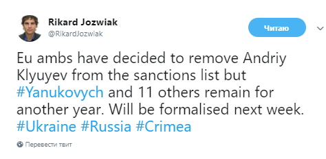 "Послы ЕС решили исключить из санкционного списка Андрея Клюева, но санкции против Януковича и 11 других его соратников продолжат еще на год", - говорится в сообщении Журналист добавил, что решение будет формализовано на следующей неделе.