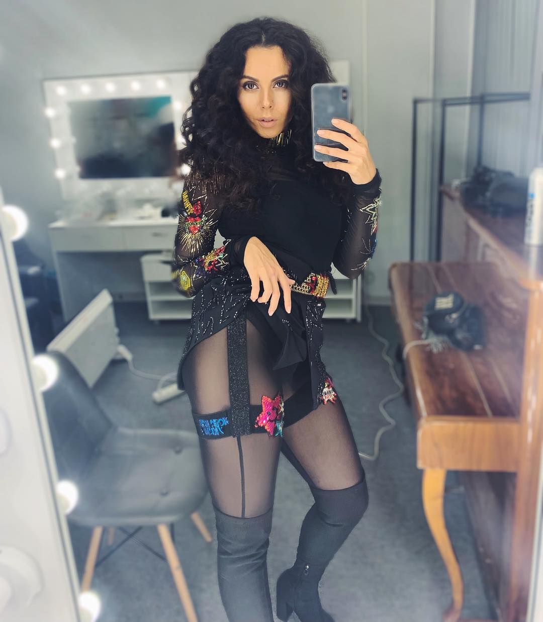 На снимке звезда без комплексов позирует перед зеркалом в смелом сексуальном наряде. Ее костюм состоит из боди с блестящей вышивкой и мини-юбки с поясом. Певица игриво приподнимает подол мини-юбки, обнажая бедра и ягодицы в капроновых колготах.