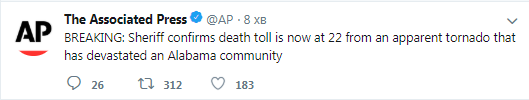 На американский штат Алабама обрушился сильнейший торнадо. Число погибших из-за разгула стихии уже составило 22 человека. Об этом в воскресенье, 4 марта, сообщило в Twitter агентство Ассошиэйтед Пресс (АП) со ссылкой на местную полицию.
