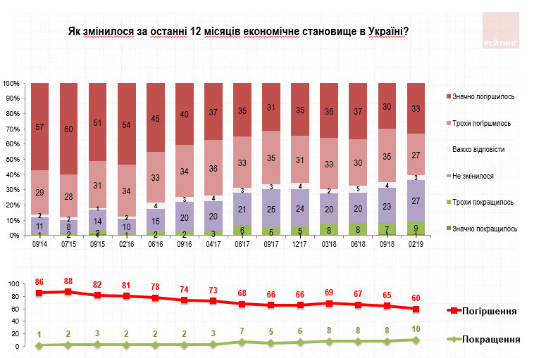 С начала года показатель респондентов, которые считают неправильным курс развития страны, достиг 65%. Часть респондентов (10%) посчитали, что за последний год экономическое положение в Украине улучшилось, 60% почувствовали ухудшение. Одновременно увеличился показатель опрошенных, которые считают, что ситуация не изменилась (с 11 до 27%).
