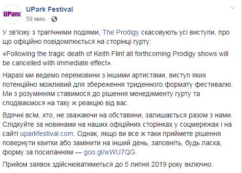 Позже группа The Prodigy сообщила, что отменяет все предстоящие концерты. А организаторы фестиваля UPark Festival, который пройдет с 16 по 18 июля в Киеве, заявили, что вернут деньги за билеты на фестиваль в связи с отменой концерта The Prodigy.