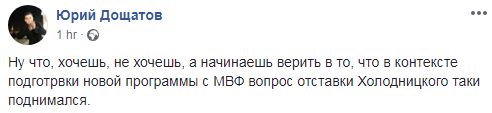 "Хочешь не хочешь, а начинаешь верить в то, что в контексте подготовки новой программы с МВФ вопрос отставки Холодницкого таки поднимался", - прокомментировал сообщение Йованович журналист Юрий Дощатов.