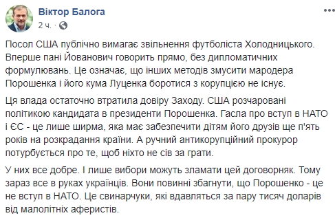 "Посол США публично требует увольнения футболиста Холодницкого. Впервые госпожа Йованович говорит прямо, без дипломатических формулировок. Это означает, что других методов заставить мародера Порошенко и его кума Луценко бороться с коррупцией не существует.