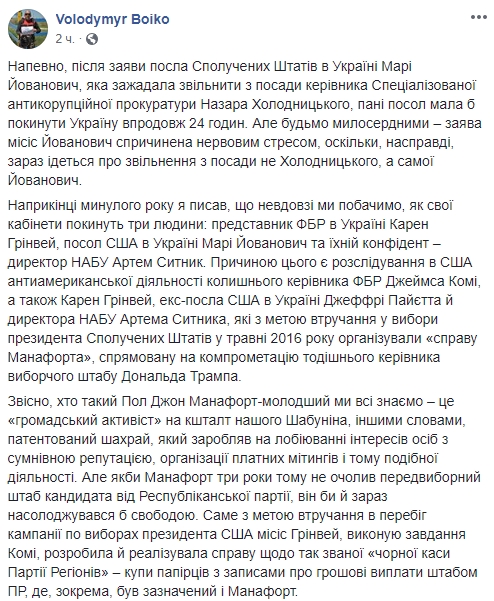 "Наверное, после заявления посла США в Украине Мари Йованович, которая потребовала уволить с должности руководителя Специализированной антикоррупционной прокуратуры Назара Холодницкого, госпожа посол должна покинуть Украину в течение 24 часов. Но будем милосердными - заявление миссис Йованович вызвано  нервным стрессом, поскольку на самом деле сейчас речь идет об увольнении с должности не Холодницкого, а самой Йованович.