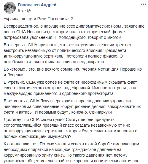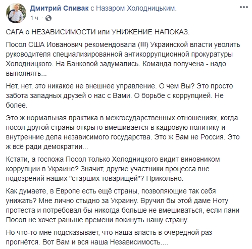 Одесский депутат Дмитрий Спивак: "Посол США Иованович рекомендовала (!!!) украинской власти уволить руководителя специализированной антикоррупционной прокуратуры Холодницкого. На Банковой задумались. Команда получена - надо выполнять...