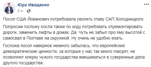 Юрист Юрий Иващенко: "Посол США Йованович потребовала уволить главу САП Холодницкого. Попросим госпожу посла также по ходу потребовать отремонтировать дороги, заменить лифты в домах. Да. Чуть не забыл про яму высотой с самосвал в Полтаве на окружной. Ну очень не удобно ехать.