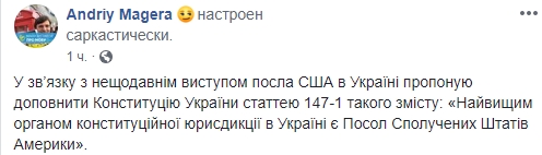 Экс-замглавы ЦИК Андрей Магера: "В связи с недавним выступлением посла США в Украине предлагаю дополнить Конституцию Украины статьей 147-1 следующего содержания: "Высшим органом конституционной юрисдикции в Украине Посол Соединенных Штатов Америки".