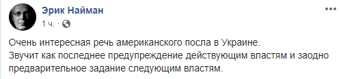"Очень интересная речь американского посла в Украине. Звучит как последнее предупреждение действующим властям и заодно предварительное задание следующим властям".