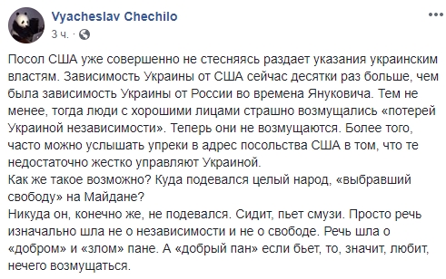 Журналист Вячеслав Чечило: "Посол США уже совершенно не стесняясь раздает указания украинским властям. Зависимость Украины от США сейчас десятки раз больше, чем была зависимость Украины от России во времена Януковича. Тем не менее, тогда люди с хорошими лицами страшно возмущались "потерей Украиной независимости". Теперь они не возмущаются. Более того, часто можно услышать упреки в адрес посольства США в том, что те недостаточно жестко управляют Украиной.