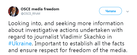 "Изучаю и собираю больше информации о следственных действиях в отношении журналиста Владимира Скачко в Украине. Важно установить все факты и обеспечить соблюдение свободы СМИ", - написал он в среду в Twitter.