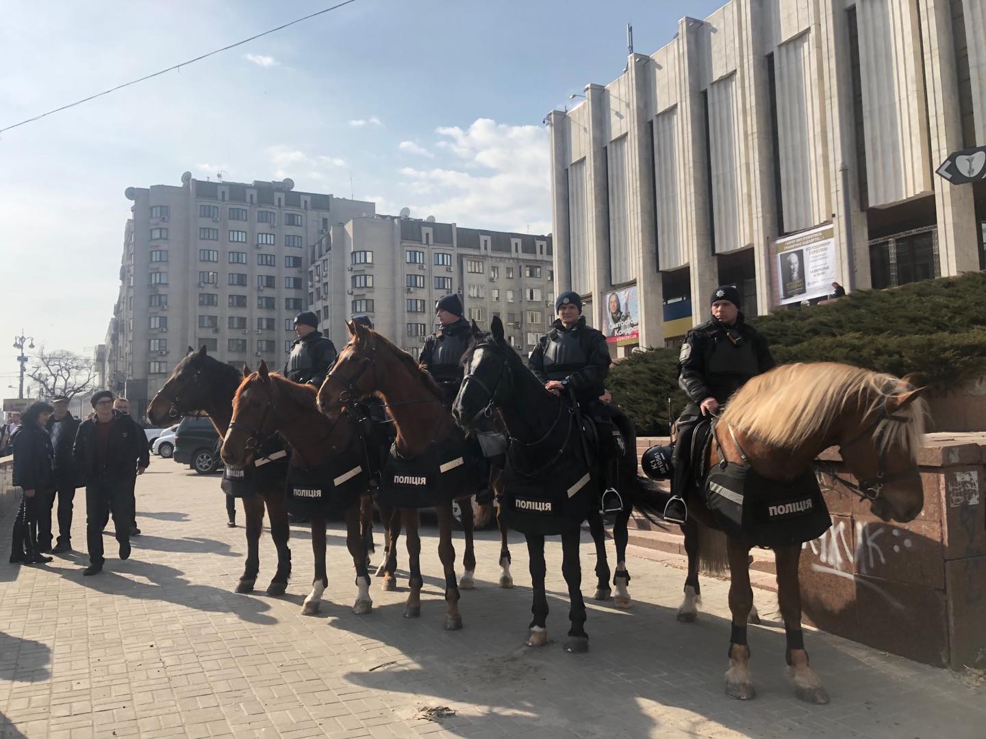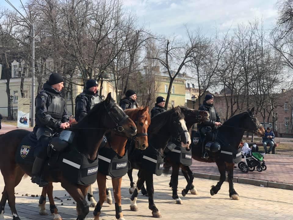 13.03 Район проведения марша в окрестностях Михайловской площади патрулирует конная полиция.