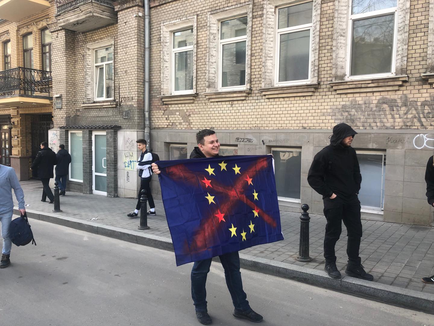 12.58 Один из радикалов развернул флаг Евросоюза перечеркнутый крест-накрест.