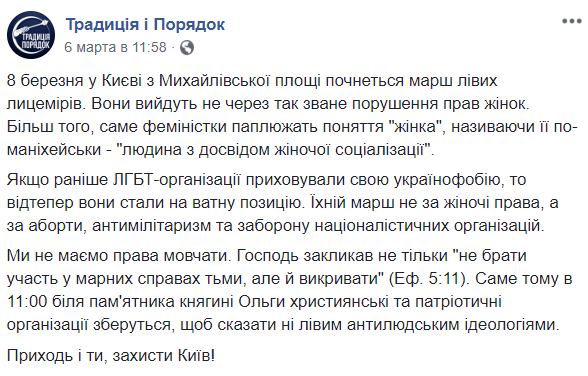 "Если раньше ЛГБТ-организации скрывали свою украинофобию, то теперь они стали на ватные позиции. Их марш не за женские права, а за аборты, антимилитаризм и запрет националистических организаций. Мы не имеем права молчать. Господь призвал не только «не участвовать в бесплодных делах тьмы, но и обличать" (Еф. 5:11). Именно поэтому возле памятника княгине Ольге христианские и патриотические организации соберутся, чтобы сказать нет левым античеловеческим идеологиям", - говорится в одном из Facebook-пабликов.