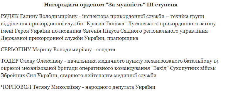 Вместе с Черновол такой орден получила пограничник Галина Рудяк из Луганской области, солдат Марина Серегина и начмед 15 ОМБР Елена Тодер.