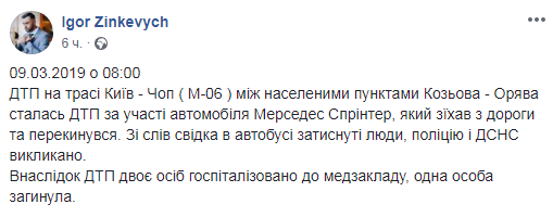 Утром в субботу, 9 марта, на трассе Киев - Чоп перевернулся микроавтобус. В результате аварии погиб один человек. Об этом на своей странице в Facebook сообщил руководитель ГО "Варта1" Игорь Зинкевич.