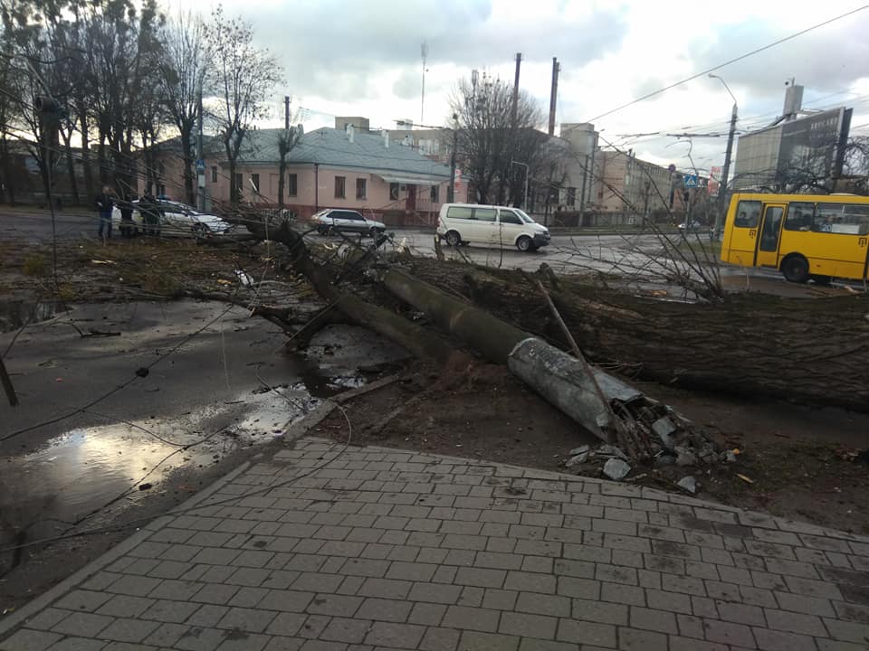 На улице Сяйво ветер вырвал дерево и повалил опору электроосвещения. Движение по улице Сяйво было заблокировано. Пострадавших нет, на месте работала аварийная бригада.