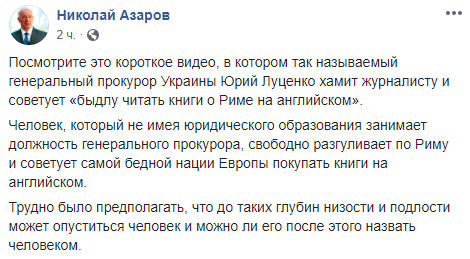 "Посмотрите это короткое видео, в котором так называемый генеральный прокурор Украины Юрий Луценко хамит журналисту и советует "быдлу читать книги о Риме на английском". Человек, который не имея юридического образования занимает должность генерального прокурора, свободно разгуливает по Риму и советует самой бедной нации Европы покупать книги на английском. Трудно было предполагать, что до таких глубин низости и подлости может опуститься человек и можно ли его после этого назвать человеком", - размышляет Азаров.