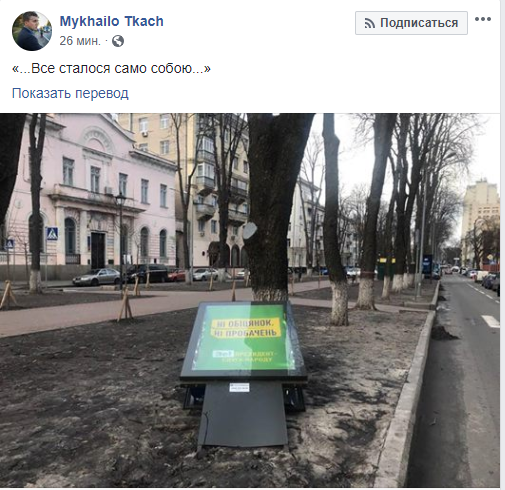 Позже выяснилось, что хвойное дерево упало возле первого подъезда, через который на работу заезжает спикер Рады Андрей Парубий.