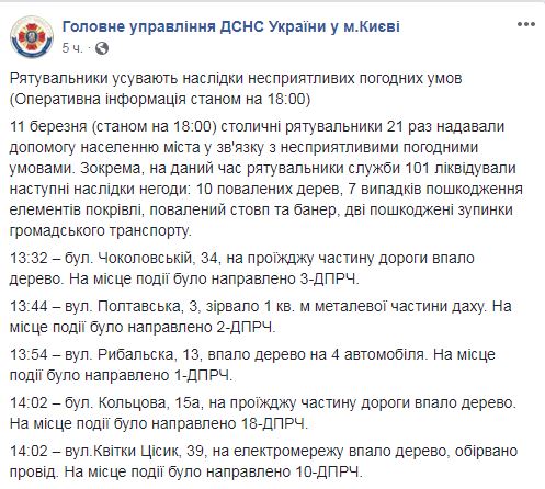 Сегодня, 11 марта, киевские спасатели по состоянию на 18:00 выезжали 21 раз для оказания помощи населению из-за последствий сильных порывов ветра, информации о пострадавших на данный момент нет. Об этом сообщается на странице в Facebook Главного управления Госслужбы по чрезвычайным ситуациям в Киеве.