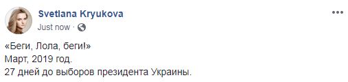 "Беги, Лола, беги! Март, 2019 год. 27 дней до выборов президента Украины", - комментирует Светлана.