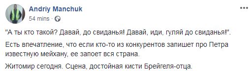 "А ты кто такой? Давай, до свидания! Давай, иди, гуляй до свидания!", Есть впечатление, что если кто-то из конкурентов запишет про Петра известную мейхану, ее запоет вся страна.", - написал журналист.