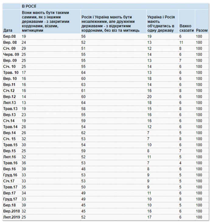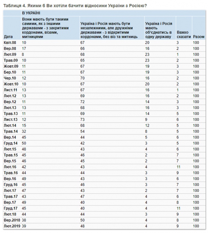 В феврале 2019 года количество украинцев, которые хорошо или очень хорошо относятся к России, выросло сразу на 9 процентов. Позитивно относятся к ней относятся уже более половины населения Украины (57%).