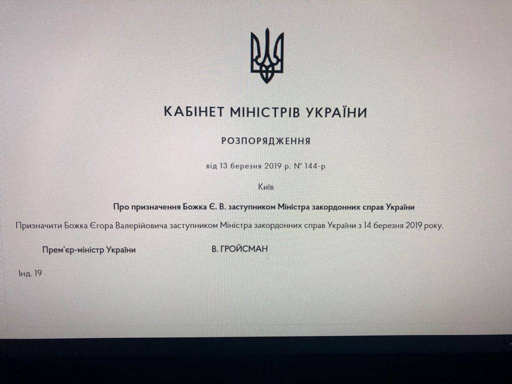 Кадровый дипломат Егор Божок, уволенный с должности главы Службы внешней разведки Украины 13 марта президентом Петром Порошенко, без работы не остался. Уже сегодня, 14 марта, он назначен заместителем главы МИД Украины. Соответствующее распоряжение Кабмина с подписью премьер-министра Владимира Гройсмана передал в распоряжение "Страны" один из нардепов.