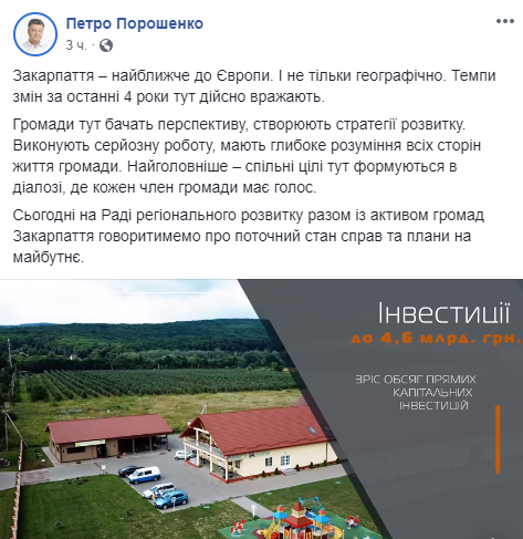11:30 На странице президента в Facebook с утра сообщают о впечатляющих изменениях в регионе: "Закарпатье - ближайшее к Европе. И не только географически. Темпы изменений за последние 4 года здесь действительно впечатляют. Общины здесь видят перспективу, создают стратегии развития. Выполняют серьезную работу, имеют глубокое понимание всех сторон жизни общества. Самое главное - общие цели здесь формируются в диалоге, где каждый член общины имеет голос. Сегодня на Совете регионального развития вместе с активом общин Закарпатья говорить о текущем состоянии дел и планах на будущее".