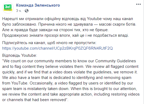 Команда шоумена и кандидата в президенты Украины Владимира Зеленского выяснила причины блокировки видео-хостинга YouTube. Судя по официальному ответу от Youtube, канал был заблокирован после массовой жалобы ботов.